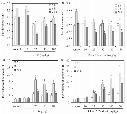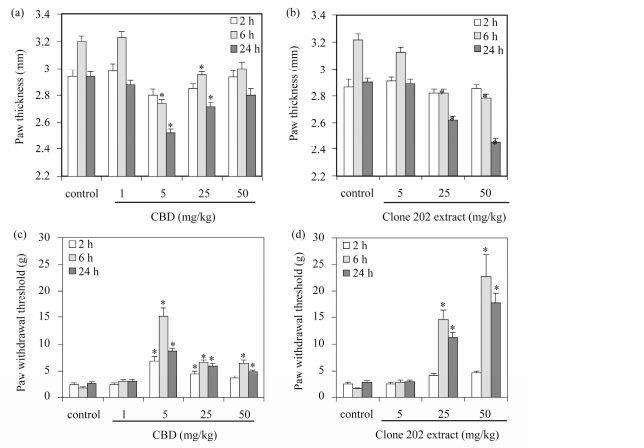 Les graphiques de données ci-dessous comparent le cannabidiol isolé (CBD) à un extrait de cannabis à spectre complet (provenant d’une souche riche en CBD). Dans tous les essais, le CBD isolé était inefficace à la fois avant et après un certain dosage, tandis que l’efficacité de la solution à spectre complet continuait d’augmenter à mesure que des doses plus élevées étaient administrées. Les résultats indiquent tous que le CBD n’est efficace que contre l’enflure et la douleur à une certaine dose, et que les solutions de cannabis contenant une gamme complète de cannabinoïdes continueront à produire des effets correspondants à mesure que la posologie augmente.
