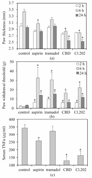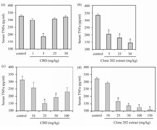 Niveaux de mesure du TNFα : La production de TNFα (facteur de nécrose tumorale alpha) dans le corps entraîne un gonflement dû à l’accumulation de liquide dans les tissus corporels. La figure ci-dessous représente l’efficacité du CBD et de l‘extrait de plante entière dans la suppression de la production de TNFα et la réduction de l’enflure. Le CBD s’est avéré efficace seulement à une dose spécifique (25 mg / kg), tandis que l’extrait à spectre complet (concentré de fleurs riches en CBD) continuait de réduire la production de TNFα à des niveaux extrêmement bas lorsque la dose était augmentée.