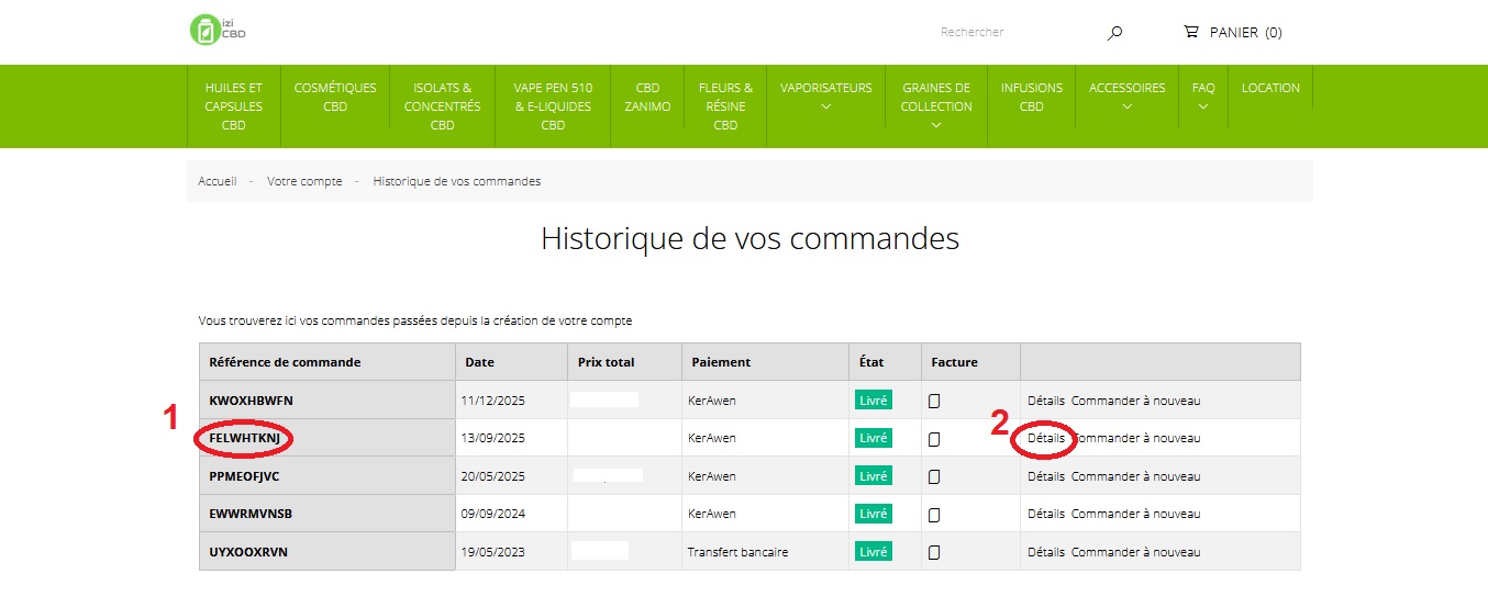 Dans cet exemple nous avons choisit la 2ème commandes reference FELWHTKNJ (1) .Ensuite cliquez sur ''Détails'' (2)