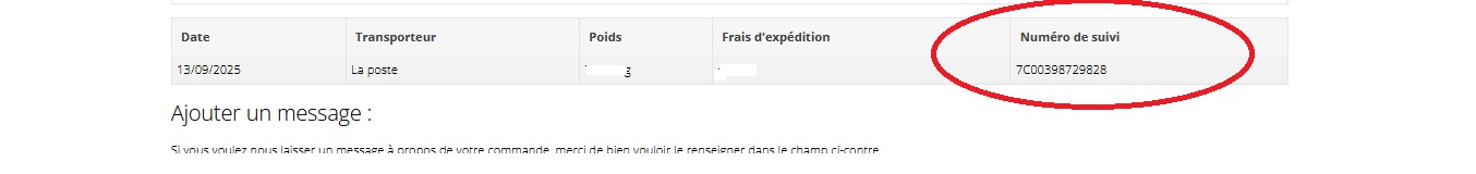 4- En bas du détails de votre commande vous trouverez un tableau récapitulatif. Sur éa dernière colonne vous trouverez votre numéro de suivi.
