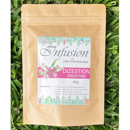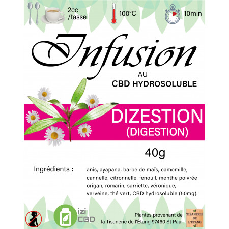 Ingrédients : anis, ayapana, barbe de maïs, camomille, cannelle, citronnelle, fenouil, menthe poivrée, origan, romarin, sarriette, véronique, verveine, thé vert, CBD hydrosoluble.
