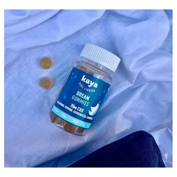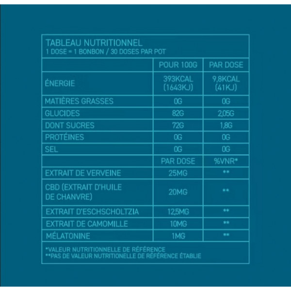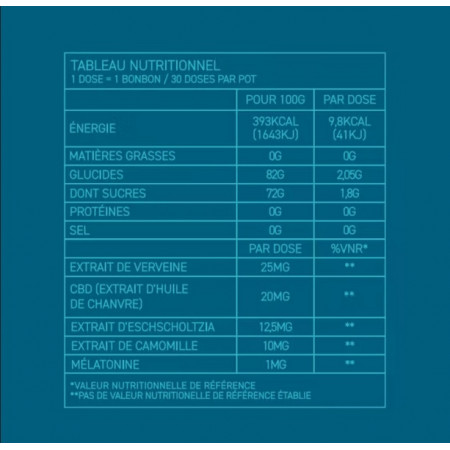 Ingrédients : Sucre, Sirop de glucose, Agent gélifiant (Pectine), Correcteur d'acidité (Acide citrique), Extrait de Verveine, CBD (Extrait d'huile de Chanvre), Arôme naturel, Extrait d'Eschscholtzia, Extrait de Camomille, Mélatonine.
