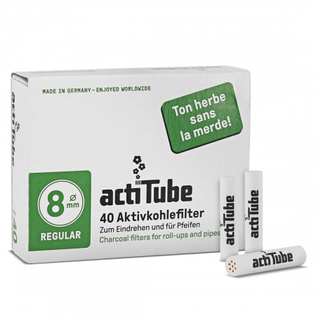 Le filtre à charbon actif REGULAR de 8 mm d'actiTube. Cette taille existait déjà auparavant dans l'industrie du tabac, mais jusque-là, elle n'était pratiquement utilisée que dans les pipes à tabac, c'est pourquoi le filtre a reçu le nom de REGULAR.