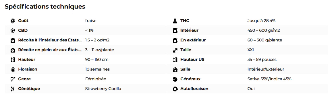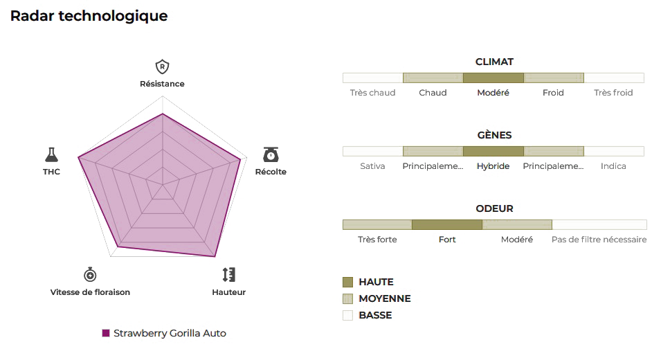 Notre sélection de génétiques exceptionnelles a donné naissance à la merveilleuse Strawberry Gorilla Auto. Un hybride spectaculaire réputé pour produire des rendements allant jusqu'à 600gr/m² en 70 jours. Cette variété est facile à cultiver mais peut atteindre 1m50, elle est donc recommandée aux cultivateurs plus expérimentés car une plante énorme peut être trop difficile à gérer pour les débutants. Cette souche hybride parfaitement équilibrée peut produire un taux exceptionnel de 28% de THC qui produit un effet puissant. Sa profusion de terpènes au parfum de baies et d’épices réhaussées d’essence réjouira vos papilles et soulagera vos douleurs musculaires tout en vous laissant avec un sourire d'une oreille à l'autre.