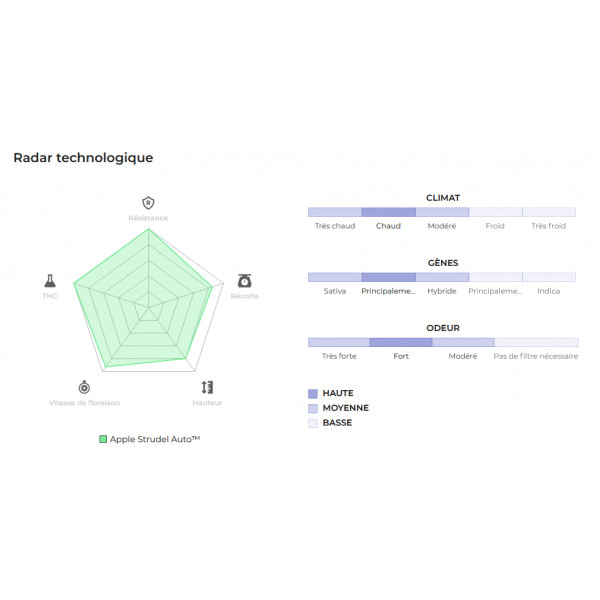 Délivrant un high énergisant puissant et durable, Apple Strudel Auto™ est parfaite pour naviguer à travers des journées exigeantes et chargées. L’expérience d’un buzz cérébral heureux, couplé à une douce relaxation, vous permet de vous détendre et de garder les pieds sur terre, tout en créant une expérience pleinement fonctionnelle. Qu’il s’agisse de relever des défis ou de rechercher une inspiration créative, cette variété à autofloraison procure un effet polyvalent qui ressource à la fois mentalement et physiquement.