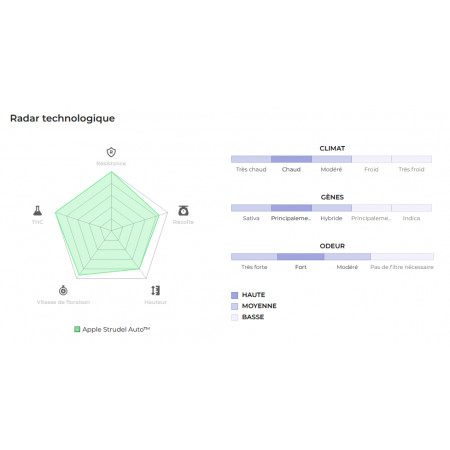 L’Apple Strudel Auto™ produit des fleurs étonnamment givrées et dures comme de la pierre. Ces sommités envoûtantes affichent un appétissant mélange de teintes allant du vert clair, culminant dans des tons violacés vers la fin de la floraison. Au fur et à mesure que la plante mûrit, les arômes sucrés évoluent, révélant des terpènes acidulés plus prononcés avec des nuances exotiques. Ce mélange harmonieux d’attrait visuel et de délicieux profils terpéniques garantit une expérience unique, du moment où vous ouvrez le bocal jusqu’à la dernière bouffée.