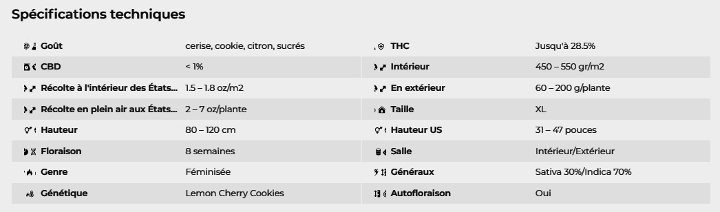 Lemon Cherry Cookies Auto™ est une preuve incontestable des progrès accomplis sur les plantes autoflorissantes modernes, avec une teneur en THC allant jusqu’à 28,5%. Au-delà de sa puissance, cette variété ravit les sens avec une saveur exceptionnelle rappelant les biscuits au citron et à la cerise et séduit visuellement avec ses magnifiques teintes violettes. Ses effets sont tout aussi impressionnants, offrant une expérience à la fois puissante et relaxante, couplée à un high cérébral béat qui bannit toute tension. Au fur et à mesure que la fumée se développe, l’influence Indica émerge, conduisant à une relaxation durable enveloppant tout le corps et instillant une sensation d’énergie créative. Idéale pour les passionnés à la recherche d’une fumée bien équilibrée de type Indica, Lemon Cherry Cookies Auto™ offre un voyage harmonieux et particulièrement satisfaisant.