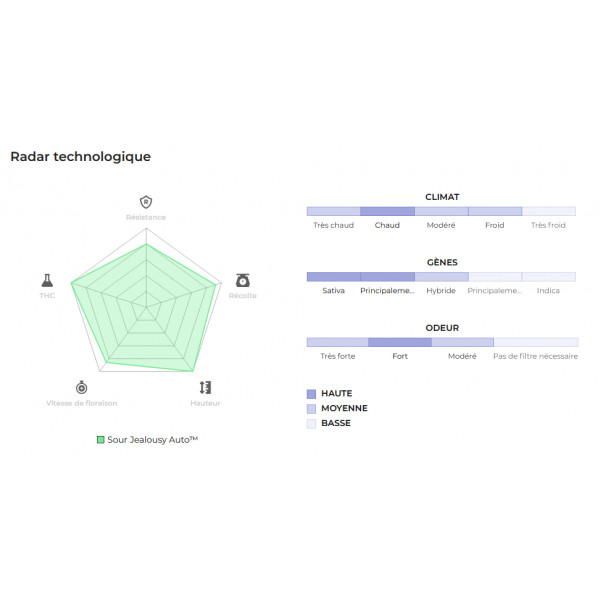La Sour Jealousy Auto™ est une géante à dominante Sativa qui peut atteindre des hauteurs de 150 cm. Sa stature générale présente la structure allongée typique des variétés Sativa, et elle se caractérise par des nombreuses et longues branches latérales qui finissent par être presque aussi hautes que la sommité principale. Cette variété produit de longues feuilles fines d'un vert intense, et des fleurs allongées formées de calices empilés les uns sur les autres, recouvrant complètement les branches de haut en bas au moment de la récolte.