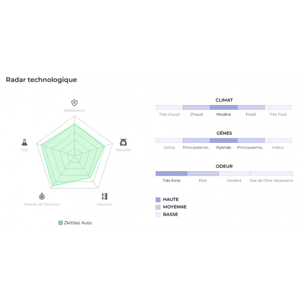 Des fleurs aussi dures et brillantes que des stalactites. La Zkittlez Auto produit de grosses têtes qui présentent toute une palette de verts et d'oranges, avec parfois des tons subtils de bleu et de violet. Un long curing fera vraiment ressortir la qualité supérieure de la Zkittlez Auto en intensifiant ses terpènes fruités complexes, à l'instar de son homologue en sachet.