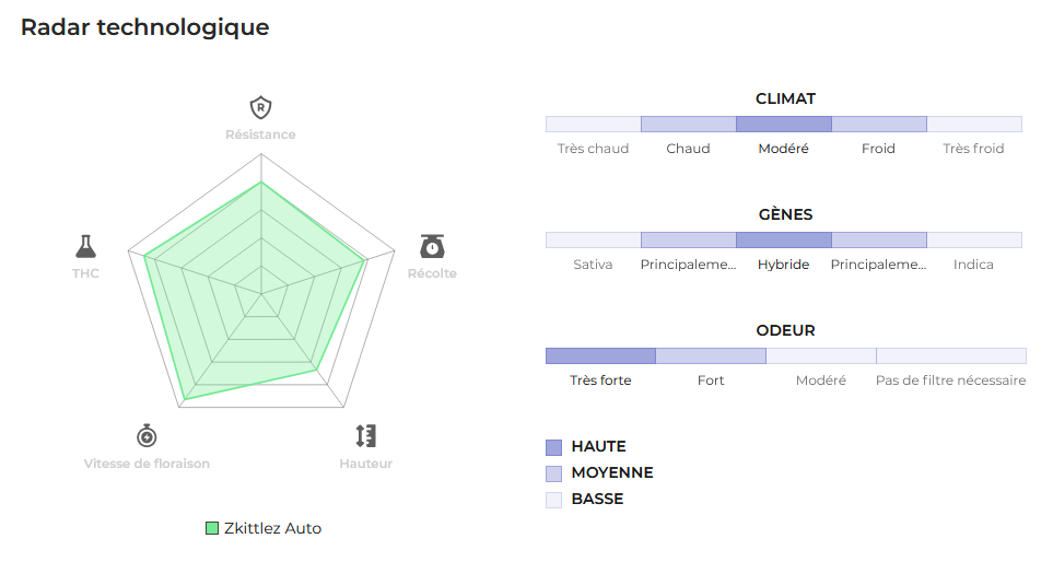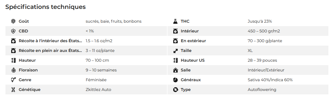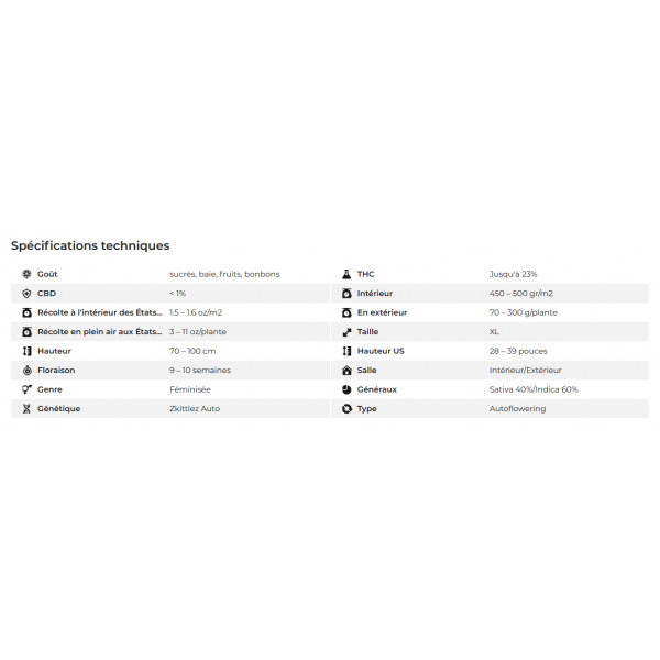 Zkittlez est parfaitement compacte, ne dépassant pas 1m de hauteur et développant plusieurs sites de floraison denses, une grande sommité principale s'élevant verticalement et quelques grosses branches latérales. En fin de floraison, attendez-vous à de grandes branches couvertes de fleurs et gluantes de résine. Dans les conditions idéales, un cultivateur chevronné peut en espérer 450-500g/m². Un espacement internodal court, une grande résistance, la plante parfaite pour se lancer dans le palissage, topping, et autres méthodes avancées d'influer sur la morphologie de vos plantes.