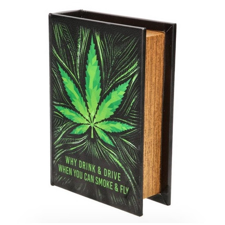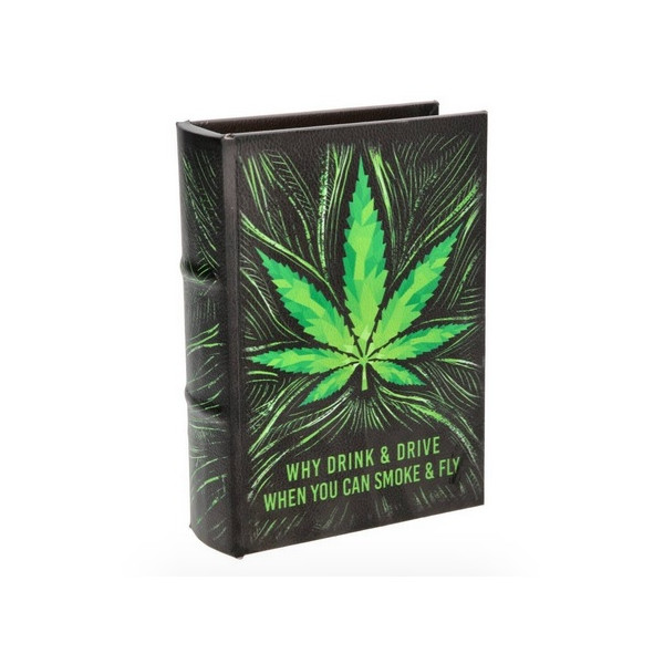 La BOITE CACHETTE LIVRE WHY DRINK AND DRIVE n'est pas qu'un simple objet de rangement. Sous son apparence de livre classique se cache une boîte en bois, à la fois discrète et esthétique. Ornée d'une feuille emblématique et de la citation provocatrice "Why drink and drive when you can smoke and fly", elle offre un clin d'œil audacieux à l'univers alternatif.