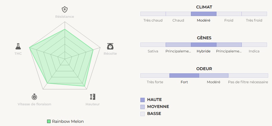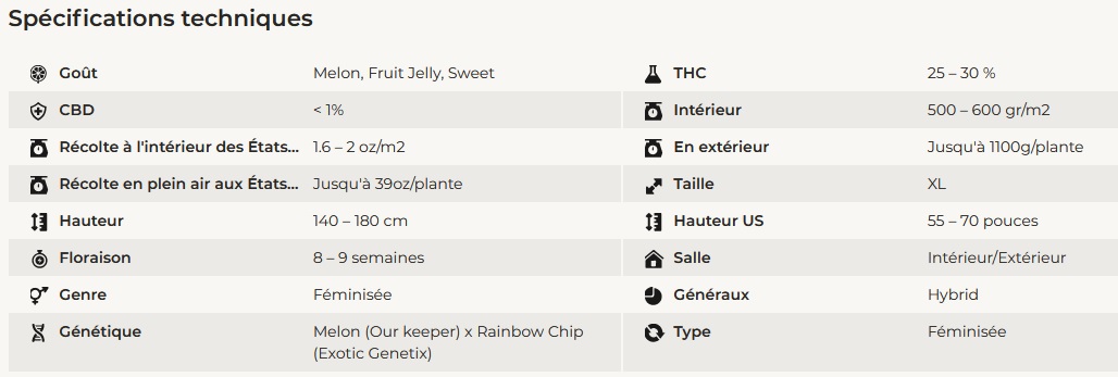 En seulement 9 semaines de floraison, vous obtiendrez une plante de taille moyenne pleine de bourgeons très denses et résineux. Son arôme s'exprime avec un profil terpénique fort et distinctif de Rainbow Chip, souligné par des notes d'agrumes de melon sucré.