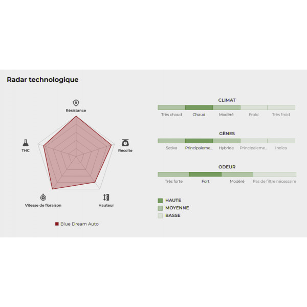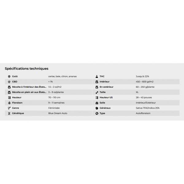 Une automatique à dominance sativa, produisant des fleurs massives se développant très rapidement. Des terpènes fruités et floraux, d'agrumes, de pin et de baies, assurent à la Blue Dream Auto sa réputation bien méritée. Elle sera prête à être récoltée entre 9 et 11 semaines, produisant des fleurs riches en THC (testées à 22%). Elle produira également une grande quantité de feuilles couverte de résine de première qualité, . Une variété très aromatique et parfumée convenant parfaitement aux débutants désireux de s’essayer un hybride à dominante sativa comme aux experts à la recherche de nouvelles combinaisons de saveurs.