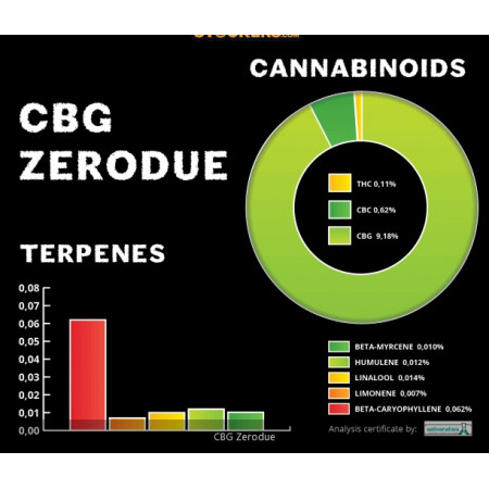 Le profil de cannabinoïdes de la CBG Zerodue présente jusqu'à 9.18% de Cannabigerol, 0.62% de CBC et 0.11% de THC, ce qui se traduit par une sensation de détente physique sans entraîner d'ivresse mentale, et fait d'elle une variété de cannabis idéale pour les usagers de cannabis médicinal et les cultivateurs recherchant des variétés de cannabis à moins de 1% de THC.